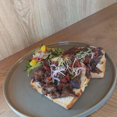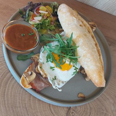 Royale uitsmijter met 3 plakken vloerbrood, 4 eieren, ham, kaas…