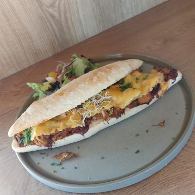 Witte Baguette met een Vega kipcorn met jamballa saus, rode…