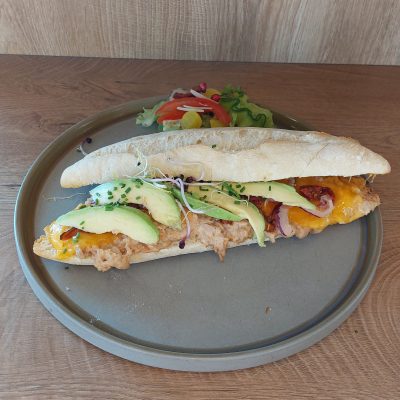 Witte Baguette, met een mexicano, rucola, rode ui, gebakken uitjes…