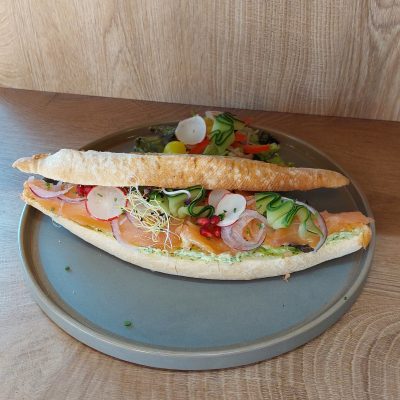 Witte Baquette met falafel bolletjes, guacamole, rode ui, sambalmayo, kruidenroomkaas,…