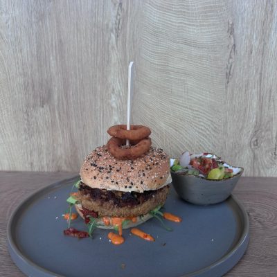Runderburger op een sesambolletje met uienringen, sla, tomaat, cheddar kaas,…
