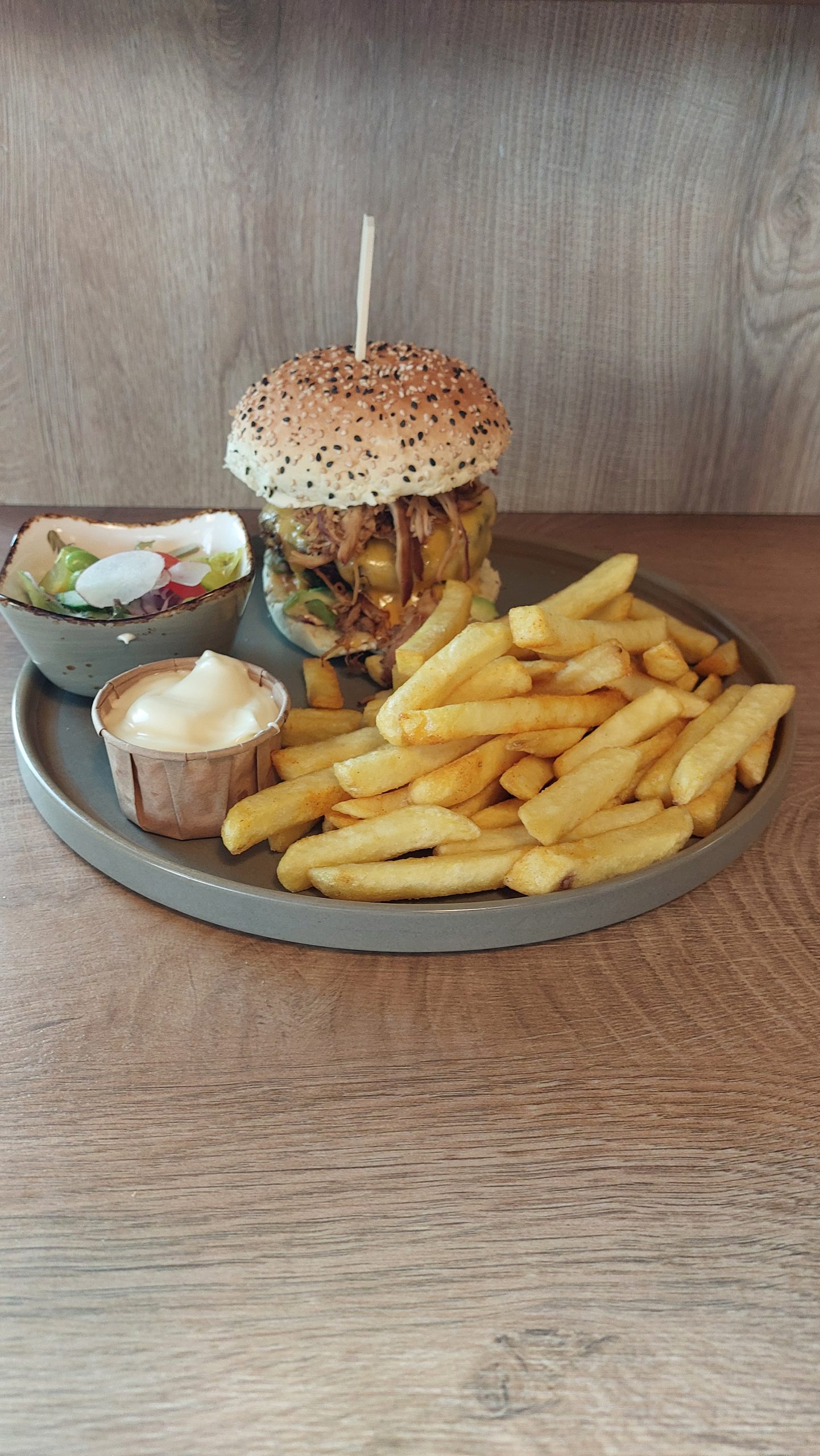 Burger van pulled chicken op een sesambolletje met sambalmayo, uienringen, rucola, avocado, rode ui en cheddar kaas en frietjes