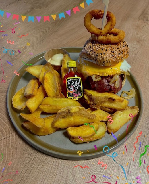 runderburger/spek/gebakken ei /cheddar/ uien/ flugel/brioche bol/scoop friet
